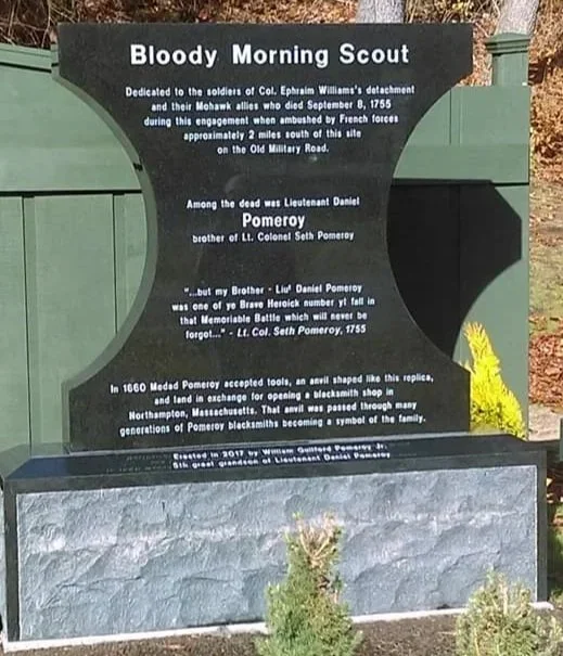 The twelfth in our series of monuments is dedicated to Lt. Daniel Pomeroy who lost his life on September 8, 1755, during an engagement known as the Bloody Morning Scout that preceded the Battle of Lake George. The battle was part of the British campaign to expel the French from North America during the French and Indian War. After the battle, Lt. Colonel Seth Pomeroy led Colonial troops to bury the dead, most where they fell, including his brother Daniel.